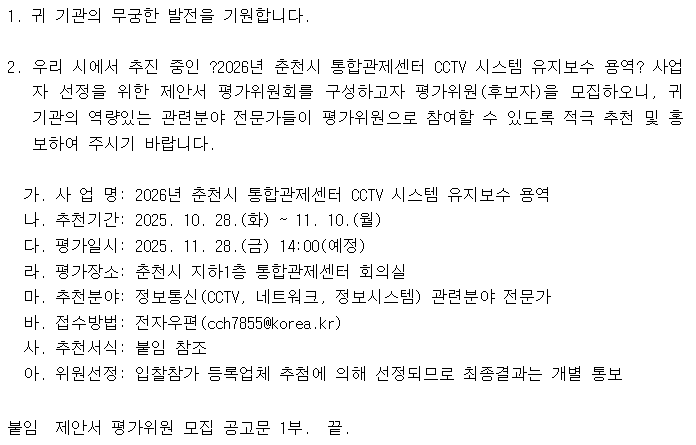 제안서 평가위원 추천요청(2026년 춘천시 통합관제센터 CCTV 시스템 유지보수 용역)