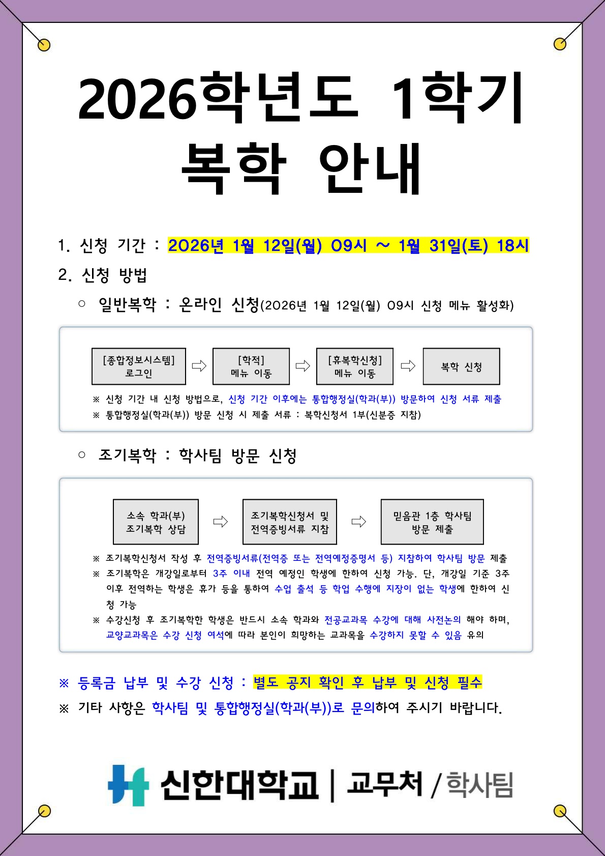 [학사팀/학적] 2026학년도 1학기 복학 안내
