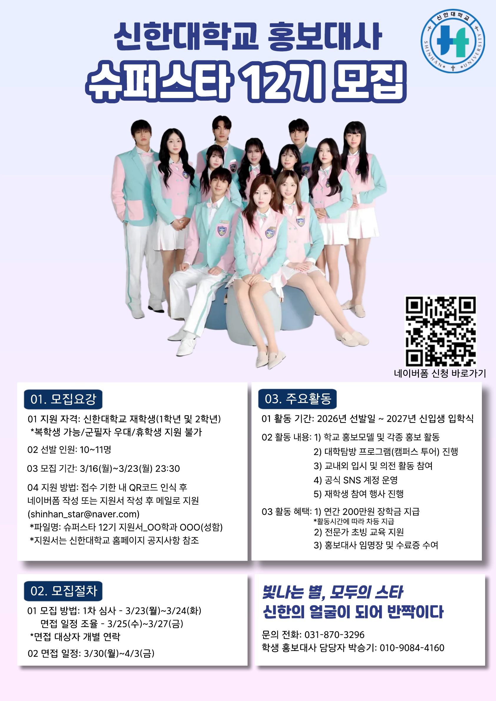 ㅁ 지원방법 : 접수 기한 내 QR 코드 인식 후 네이버폼 작성 또는 붙임파일 작성 후 메일로 지원 (shinhan_star@naver.com)