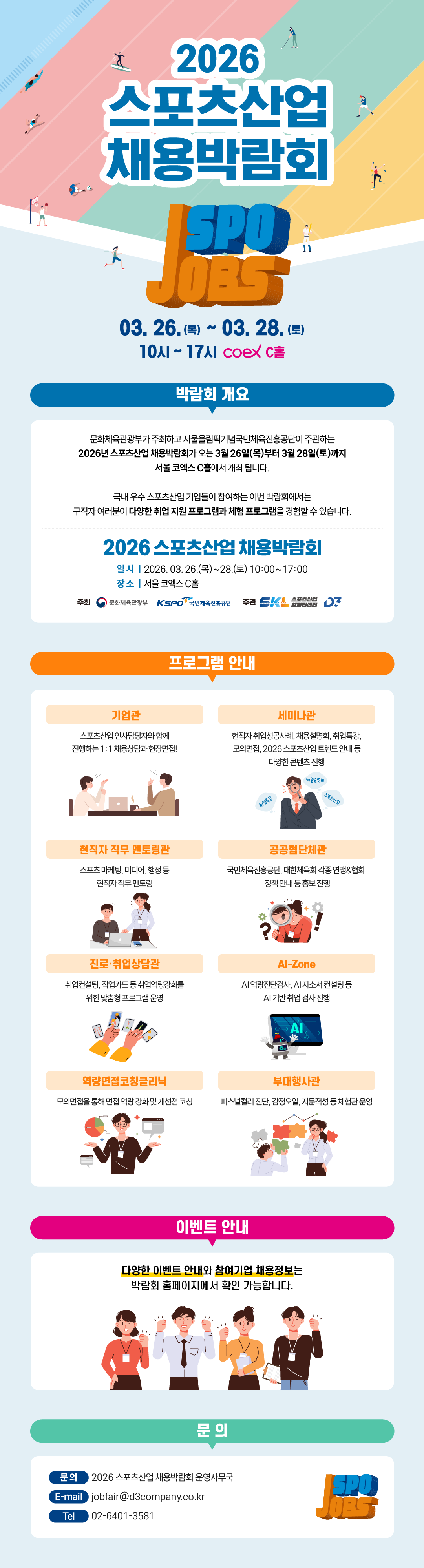 문화체육관광부, 서울올림픽기념국민체육진흥공단이 주최하고 스포츠산업 일자리센터, ㈜ 디3이 주관하는 2026년 스포츠산업 채용박람회가 개최됩니다.