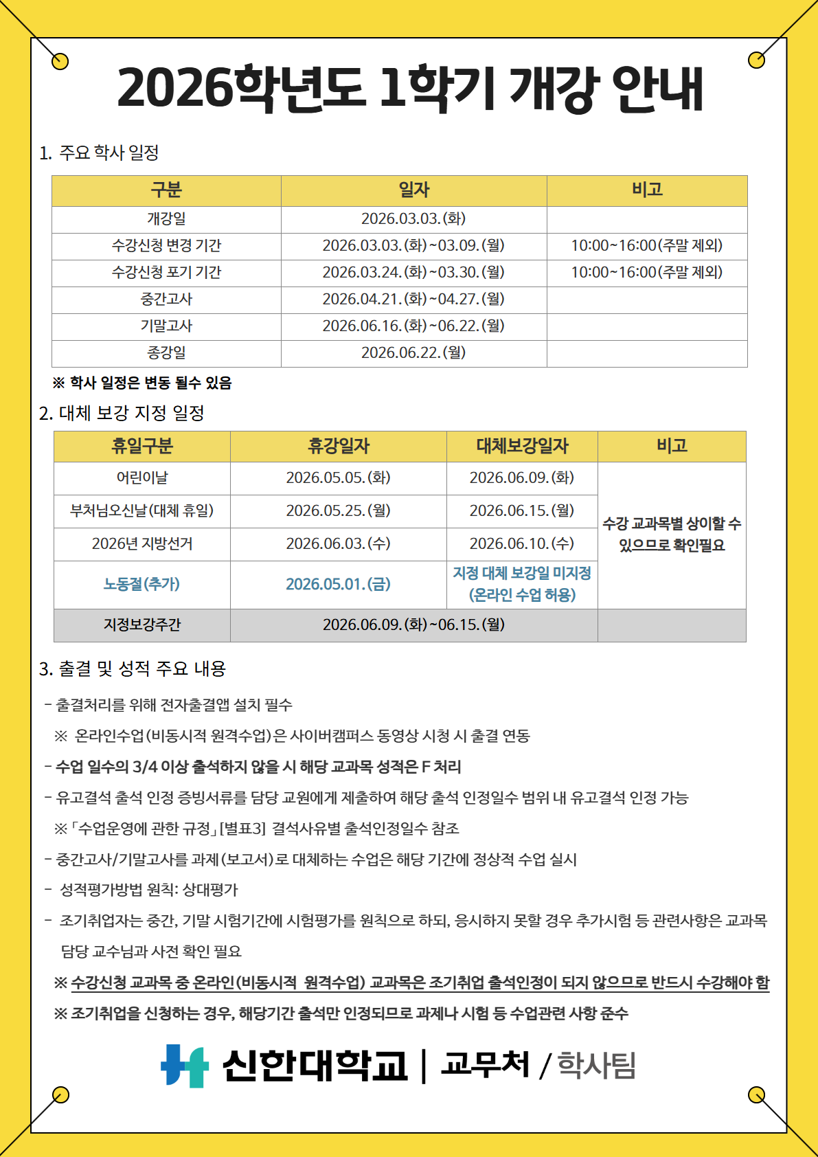 [학사팀/수업] 2026학년도 1학기 개강 관련 일정 수정 안내
