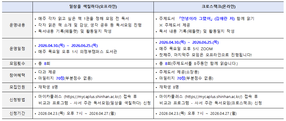 ■ 독서모임 신청은 MYCA+ 에서 신청하시기 바랍니다. https://mycaplus.shinhan.ac.kr/