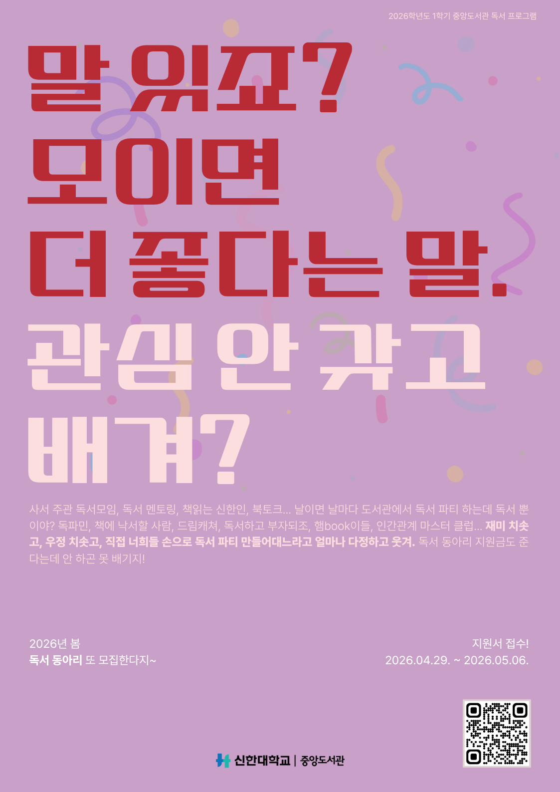 - 신청방법: 신한대학교 MYCA+(https://mycaplus.shinhan.ac.kr/) → 비교과 프로그램 → 재학생 독서 동아리 신청(★신청서 첨부 필수★)