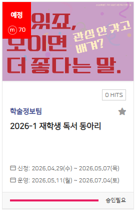 - 선정된 팀은 신청서 검토 후 2026.05.08.(금) 개별연락 및 도서관 홈페이지 공지 예정
