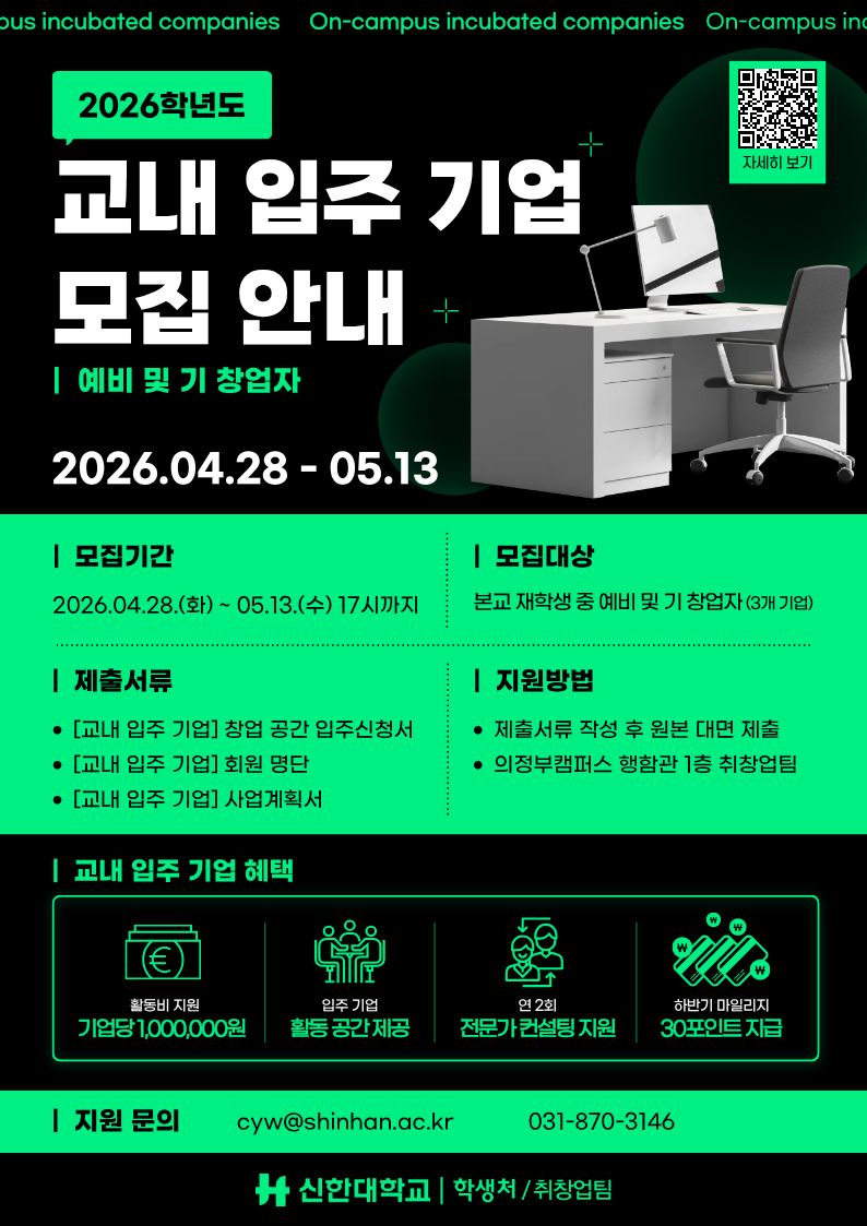 학생처 취창업팀에서 예비창업자와 초기창업자의 창업역량과 창업의지 향상을 위한 2026학년도 대학생 창업 지원사업 [교내 입주 기업]을 모집합니다. 창업에 관심 있는 예비(초기) 창업 재학생들의 많은 참여 부탁드립니다.